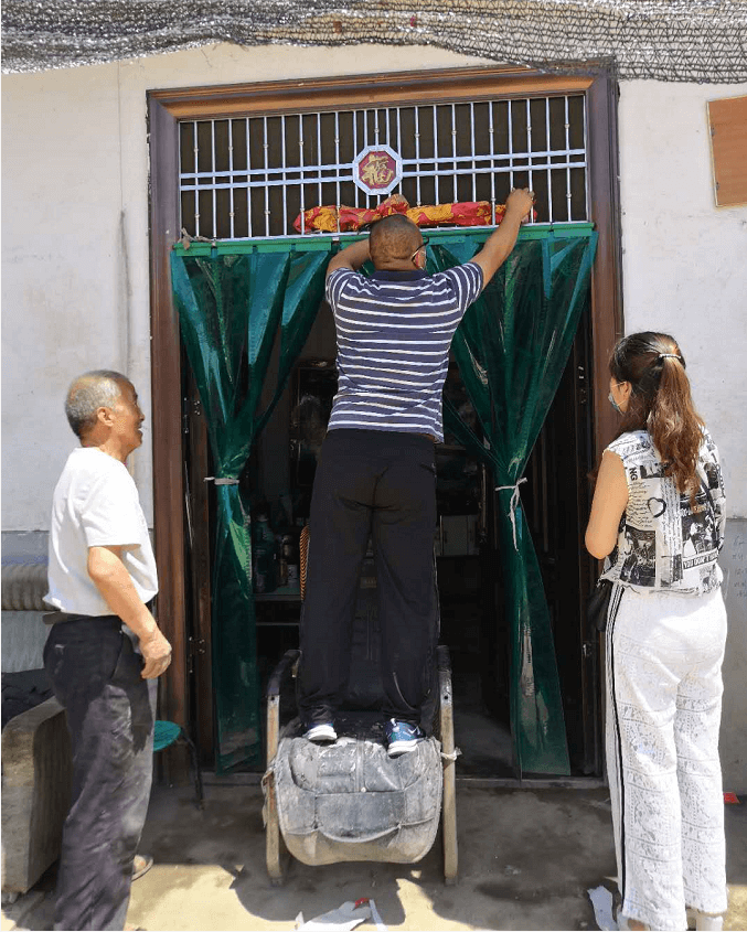 西安水建集團副總經理吳振江為幫扶對象擦拭門上的灰土